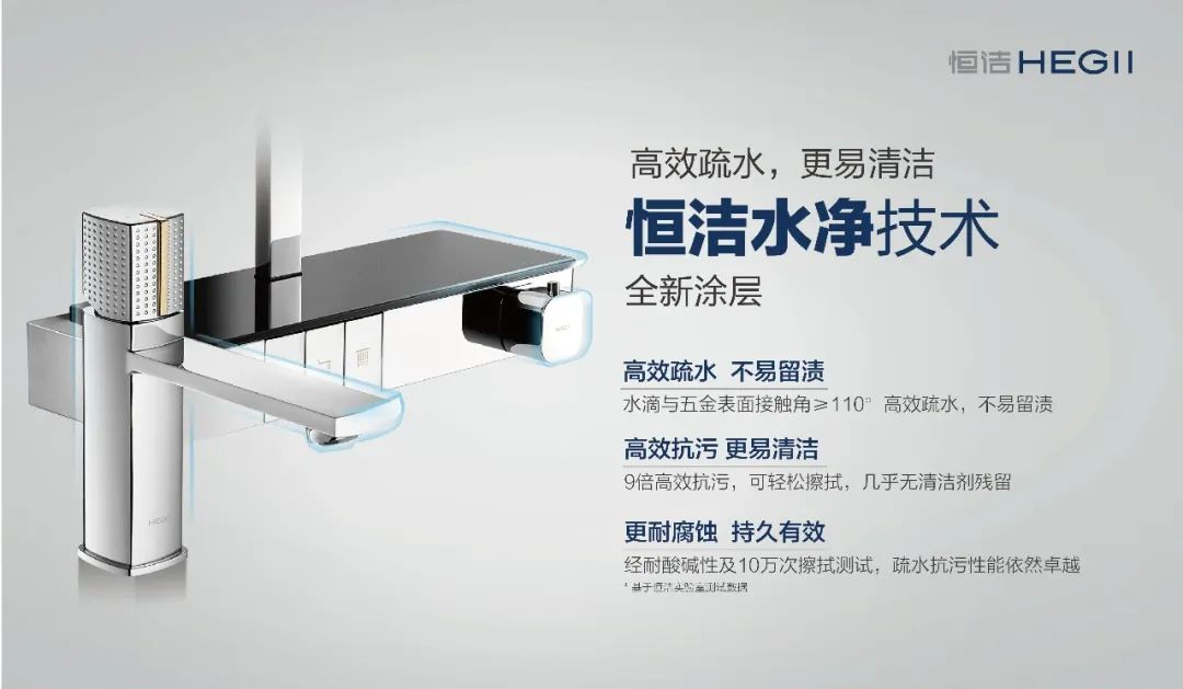 再如,衛(wèi)浴生活中長期存在的痛點——水垢和污漬。水龍頭、花灑等衛(wèi)浴五金,使用過后一旦清潔不及時就容易水漬斑斑,甚至生銹,不僅會讓衛(wèi)浴五金失去光澤,還容易滋生細菌。雖然網(wǎng)上針對水垢的清除,有各種各樣的方法,但大多治標不治本。恒潔創(chuàng)新推出的水凈技術,直擊水垢、污漬等痛點,從源頭上解決衛(wèi)浴產品的清潔難題。目前,恒潔水凈技術已經(jīng)應用在恒潔坐便器、花灑和水龍頭等多種產品上,以實用科技助力用戶升級品質生活。