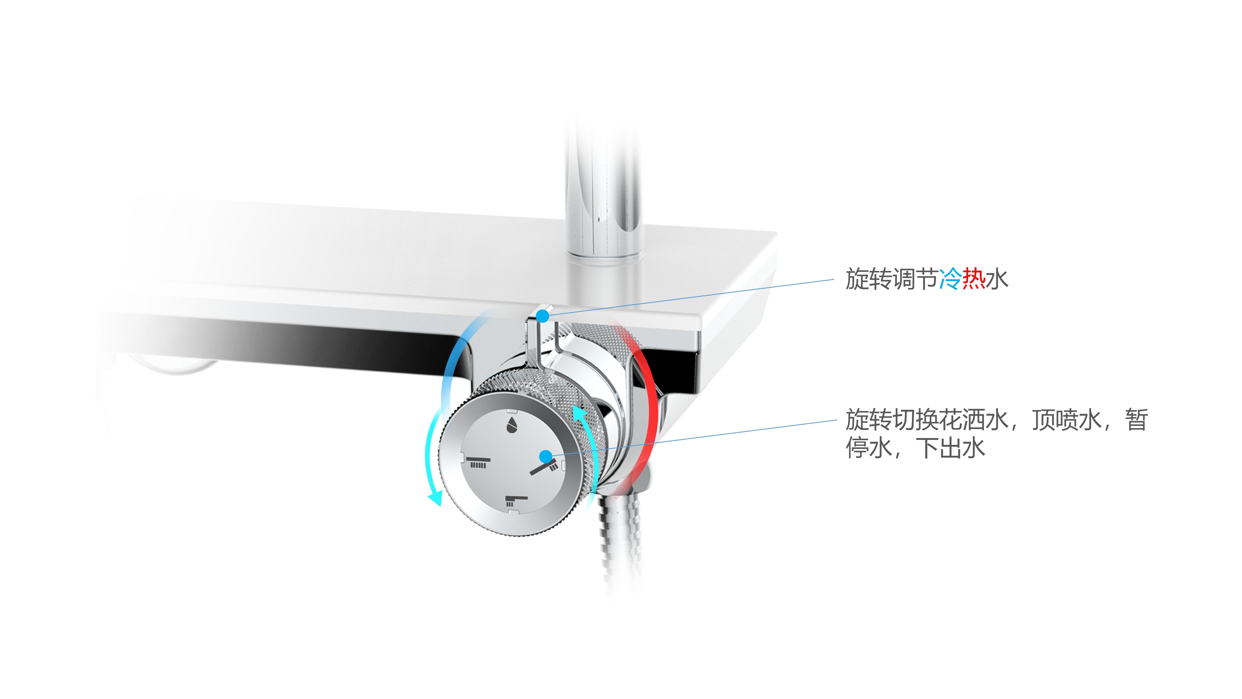 帶下出水大平臺置物;旋鈕切換四種模式出水